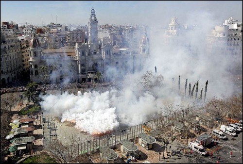 La pirotecnia toma diversas formas en las fiestas falleras: castillos de fuegos artificiales, “mascletaes”, “cremà” de la falla y petardos de todo tipo que niños y mayores tiran en la “despertà” (a las ocho de la mañana en la semana fallera).